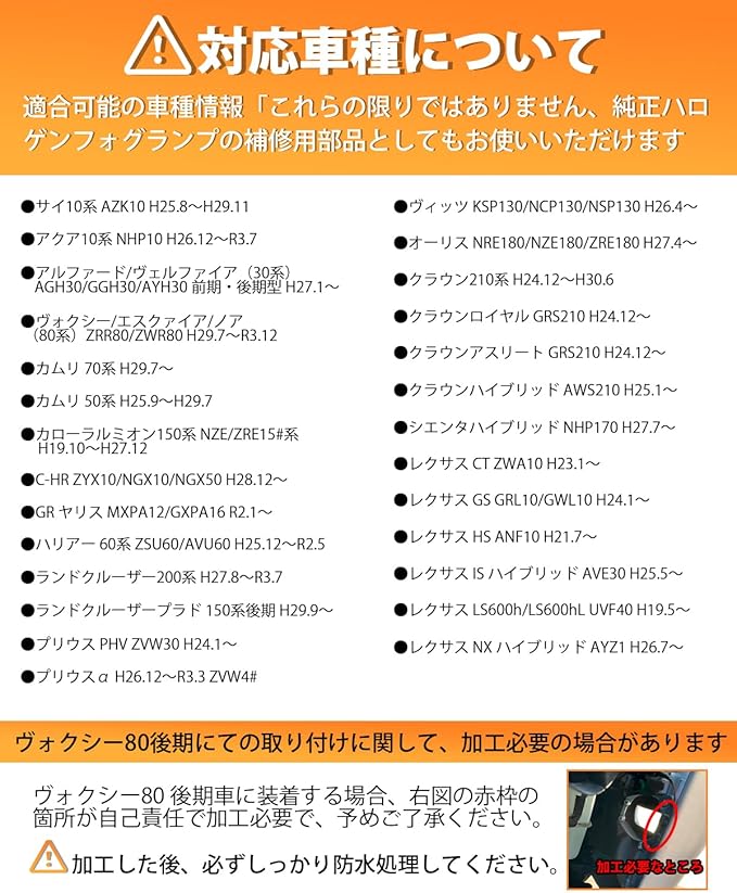 【純正交換&光軸調整可能】弊社のフォグランプ ユニットはトヨタ車汎用 フォグランプユニット、一部の対応車種:プリウス30 α、80系 ヴォクシー/エスクァイア/ノア、30系 アルファード/ヴェルファイア、アクア10系、カムリ 50系 70系、カローラルミオン150系、ランドクルーザープラド 150系後期、クラウン210系、C-HRなど適合。適合バルブ:H8 H16 兼用 LED フォグランプ(H16の場合、ハロゲンバルブも対応でき)。十字ドライバーなどの工具を使ってユニット後方のネジを回すだけ、お好みの位置で光軸を固定出来ます。ご注意:H11 LED適用不可です。)