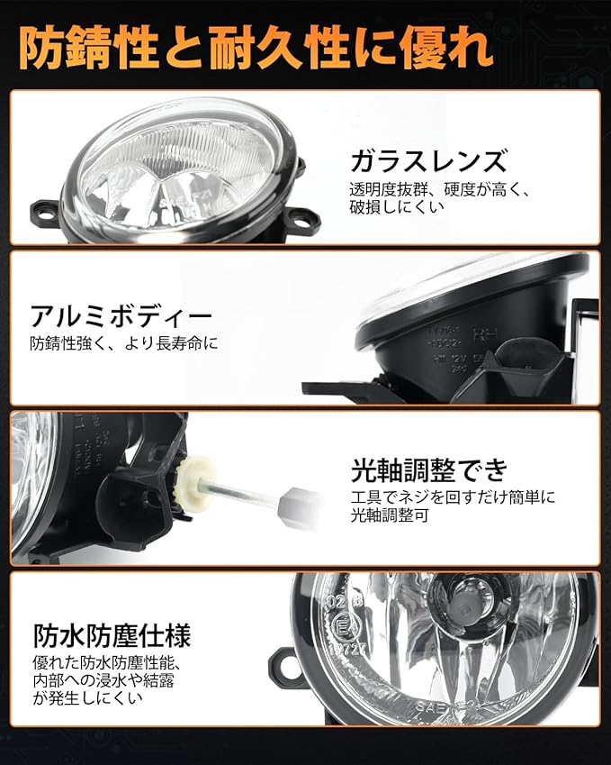 【防錆性&耐久性アップ!】BORDAN社 フォグランプ ユニットは航空用アルミボディーとガラスレンズの組み合わせにより圧倒的に高い質感を実現!高品質なアルミニウム合金を採用し、優れた防錆性能で、多湿、塩害などの過酷な環境にも強く、長寿命を実現します。熱に強いガラスレンズは、優れた耐熱性能を誇り、長期使用による黄ばみ、ひずみ、劣化が発生しにくく、フォグランプの長期安定性を確保します。