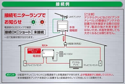 【特徴】地上デジタル放送に対応した、低雑音で高出力の電源分離型ブースターです。
