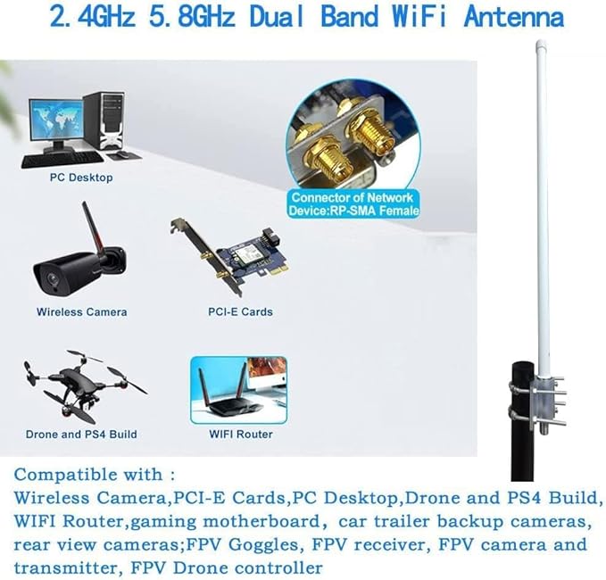 機能:適切に配置されている場合、WiFiアンテナは、より良い受信、信号強度の向上、WiFiホットスポット(ルーター /カメラ)の範囲を拡張するのに役立ちます。