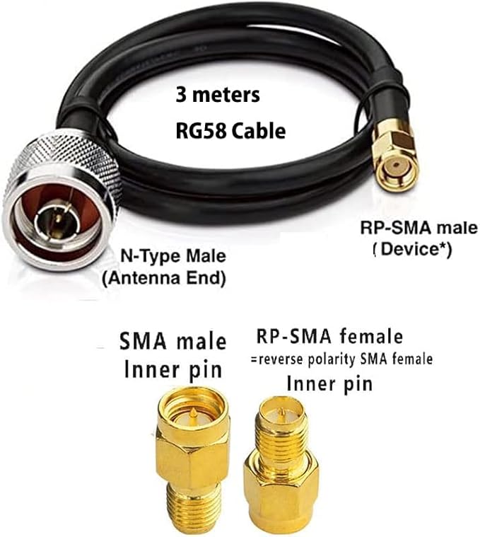 コネクタ:端にn男性が付いたケーブル(このアンテナ用)。 ワイヤーのもう一方の端にあるコネクタのタイプはRP-SMAメス(デバイス用)です。パッケージにはRP-SMA男性からSMA男性アダプターが含まれています。デバイスがSMAコネクタの場合は使用できます。
