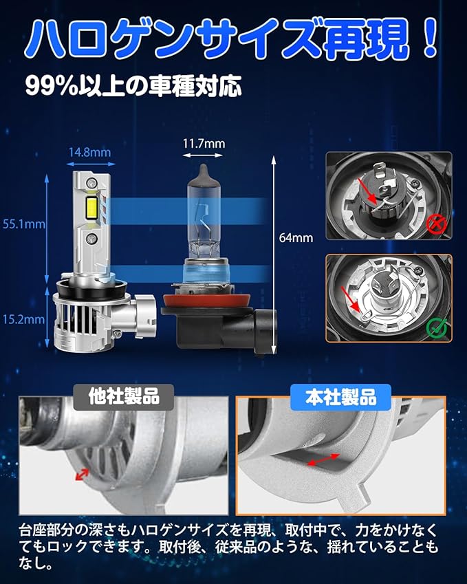 『ポン付け LED H11』スパリー H8 led は純正ハロゲンサイズ1:1設計で配線不要。プラグ&プレイ式でポン付け、DIY初心者でも5分以内で設置完了。旧車の反射鏡干渉リスクを解消し、専門業者不要の簡単交換。H11 LEDの手軽さが年間コスト削減に貢献。※元H11/H8/H16規格採用車専用