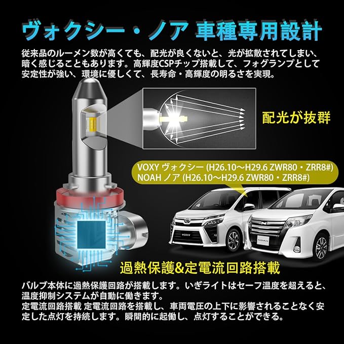 ▶車検対応・1:1ハロゲン再現・無極性・過熱保護&定電流回路搭載: LEDバルブは純正と同じの設計、発光点を本物の電球に合わせることで、クリアなカットライン発光を実現しました、必ず車検通過条件のフォグランプ用バルブです。ホワイト(6000K)とレモングリーン(3200K)の光色も車検を通るので安心です。 キャンセラー内蔵(国産車対応)で、99%の車に適合。 バルブ本体に過熱保護回路が搭載します。いぎライトはセーフ温度を超えると、温度抑制システムが自動に働きます。 定電流回路搭載 定電流回路を搭載し、車両電圧の上下に影響されることなく安定した点灯を持続します。瞬間的に起働し、点灯することができる。