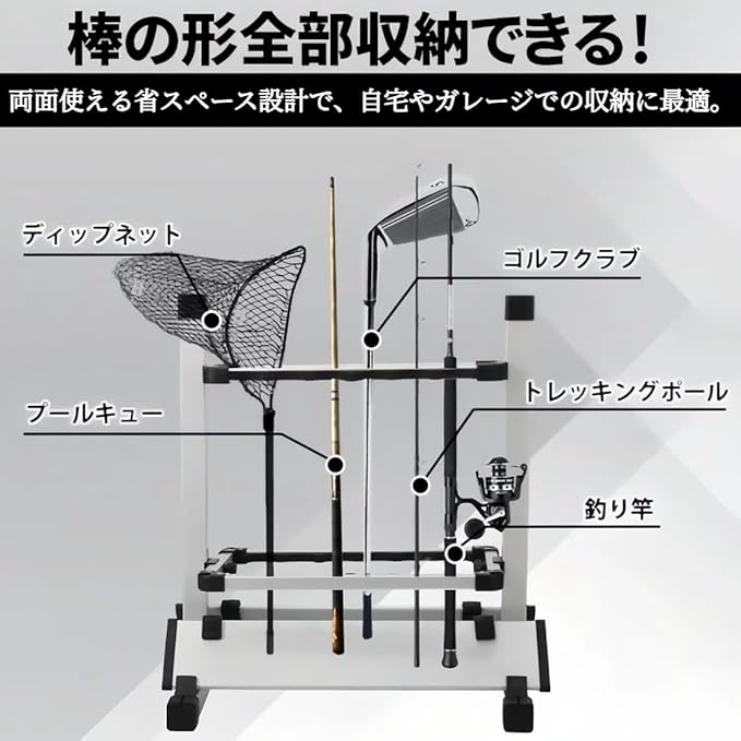 【最大12本収納&両面ディスプレイ対応】釣竿を最大12本収納可能なロッドスタンド。両面使える省スペース設計で、自宅やガレージでの収納に最適。しゃれな釣竿収納ラックとしても活躍します。
