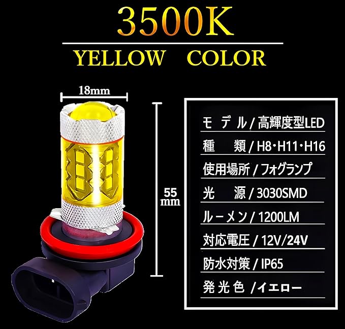 【商品規格】 ●タイプ : H8H11H16・HB3 LEDバルブ 2個 ●色温度:3500K(イエロー) ●ルーメン:2400LM ●LED数量:3030LED素子16個/1バルブ ●視野角:360 ●対応電圧:12V-30V ●消費電力:70W ●使用寿命:50000時間 ●車検対応