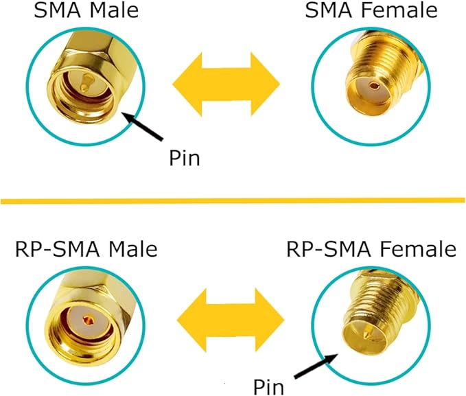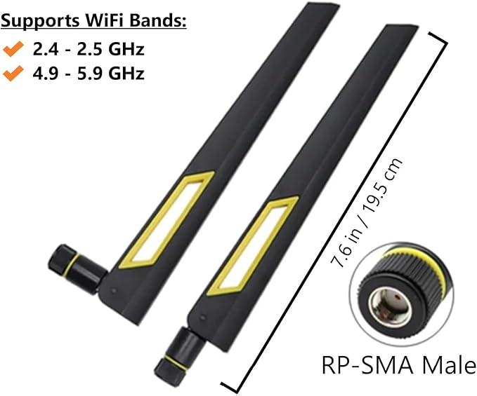 Boost your Wi-Fi! Upgrade your router and/or wireless adapter with high-gain antennas! Specifications:Frequency Range: 2.4 / 5 GHz Wi-Fi bands (2.4 - 2.5 GHz /4.9 - 5.9 GHz)VSWR: <=1.5Gain: 10 dBi (MAX)Polarization: VerticalMaximum Power: 50WConnector Type: RP-SMA MaleColor: Black and GoldLength: 7.6 in / 19.5 cm
