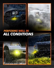 【視認性の高いイエローフォグランプ】イエローのLEDフォグランプは高輝度の6連LED素子を搭載し、明るさは8000LMまで 達し、均一で高効率な発光を実現しながら、安定性も大幅に向上させます。光は視認性の高いイエローで、大雨の中屋 道の悪い路面を走行しても見やすくなり、心強くご利用頂けます