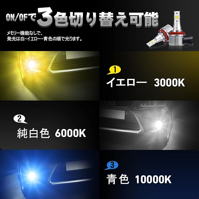 【3色切替】 明るさ十分のLEDフォグランプですが、なんと色が変えられます!ホワイト(6000K)/イエロー(3000K)/ブルー(10000K) 、雨天時や濃霧時にも見やすさ確保!気軽に色を変えたい方にもおススメです!