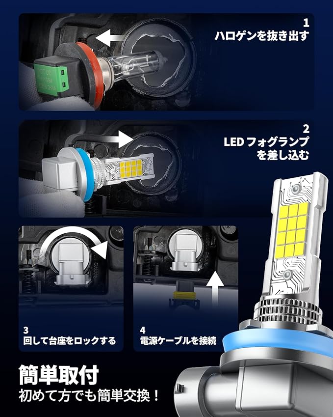 【1:1サイズ&5分で簡単取付】この LED フォグは、ハロゲンと1:1で再現されたデザインを持ち、既存の取り付け部品と交換するだけで使用できますので、複雑な配線が不要で、初心者の方でも手軽に愛車のライトをアップグレード可能です。注:内蔵抵抗により、99%の車種に対応しており、一部の車種では車の電気配線上では球切れと誤検知してしまうた、警告灯/消灯/点滅現象が解消されない可能性がございます。この場合は、追加の抵抗器が必要です。