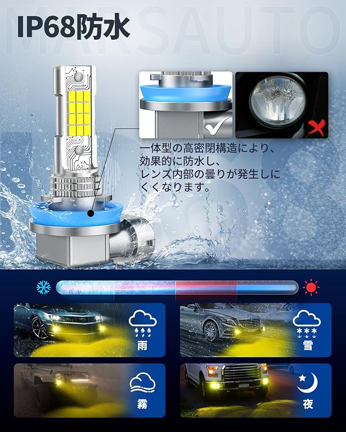 Marsauto h11 led フォグランプ 爆光 H8 led フォグ イェロー 車検対応 10000LM フォグランプ LED H8 H11 H16 バルブ IP68防水防結露 キャンセラー内蔵 0.1s瞬間起動 ledフォグライト 3000K 24連 LEDチップ搭載 DC12V対応 50000時間以上寿命 黄色 2個セット 2年保証(JF2シリーズ)