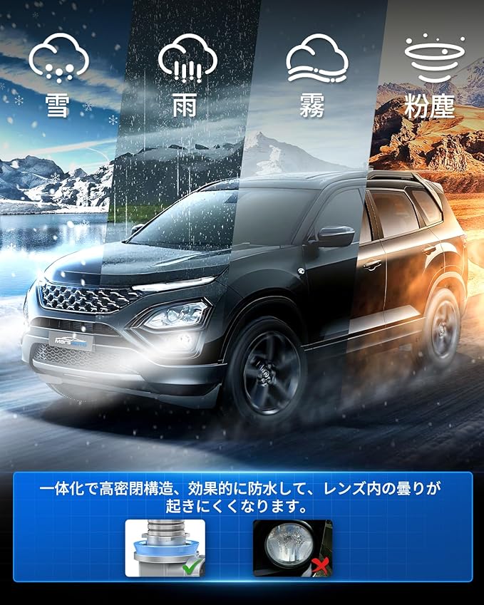 【IP68防水構造&全密封設計】多様な環境への適応!IP68防水コーティングとフルクローズドブロック設計がなされており、内部の電子部品が水分や湿気から守られ、安定した動作を維持します。雨の中を運転する場合や、泥濘の道を走る場合でも、はっきりとした視界を確保し、安心して運転することができます。