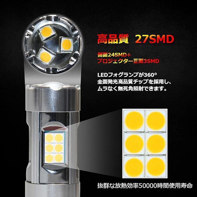 【製品情報】:H8/H9/H16 兼用、LED フォグランプ、イエロー 黄色 3000K、高品質 LG 27SMD(側面24SMD+プロジェクター正面3SMD)を搭載、悪天気(雨、霧、雪など)の視認性を大幅に向上させます、事故を削減し、安 全運転を確保します。【ご注意】本商品は日本車専用で、欧州車に使うと、取付車両によってチラつきや不点灯などの場合もあり、メーターに球切れや警告灯などエラー表示が出る場合もあります。