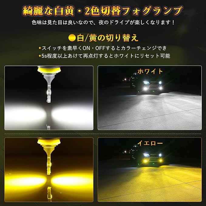 【黄白の2色切り替えフォグランプ・高輝度】H8/H11/H16適合のフォグランプはハロゲンランプより約10倍明るいLEDチップを使用し、綺麗なホワイトやイエローを発光します。1つのバルブで、2色の切替えが別スイッチ付けなくても作動する所がとても良いです。フォグランプのスイッチのON、OFFでライトの色を白色から黄色に変えられるLEDバルブです。雨の日など、路面がぬれている状態だとホワイト色だと反射してしまい見にくいですが、イエローに切り替える事で視認性が格段に上がるので、夜間の雨の日でも順調して走行できます。