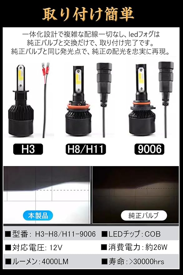 【超高発光効率COBチップ】この H8/H9/H11/H16 led フォグランプは COBチップ採用、均一・高効率の発光特典を持って、超輝度で普通のチップと比べ発光率はアップします。市販のハロゲンより省エネルギーの上で、明るさは大幅にアップ。夜間の走行が非常に楽になり、安全に運転しています。