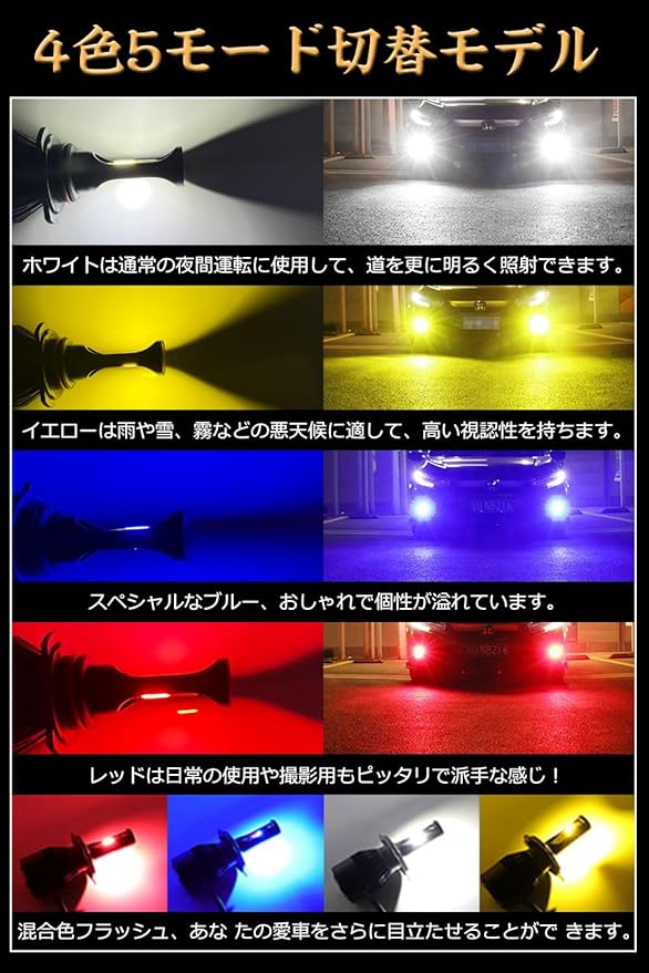 【4色5モード切替モデル】この h11 led フォグランプ は 一つのバルブには4種のLEDチップを採用し、切り替え制御機能を融合します。発光モードはホワイト、イエロー、青、赤、混合色フラッシュになりますが、一つスイッチON/OFFだけで四つの色温度が切替えられます!刻々と変化する路面の状況に応じて、順応する驚きの4色5モード切り替え機能を楽しみましょう。
