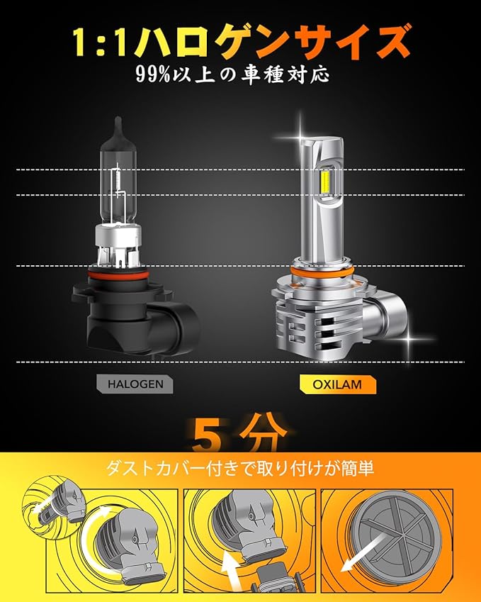 【ポン付け&取付簡単】ユニットとエンジンの間が狭くて、手を伸ばせない、取付は専門店の高料金をかからないといけません?OXILAM hb3 LEDヘッドライトはハロゲンバルブと同じサイズで、外部ドライバや追加の外線がないオールインワン設計のため、ハロゲンバルブのようにポン付けで、改造や取り付けの問題が100%ありません。