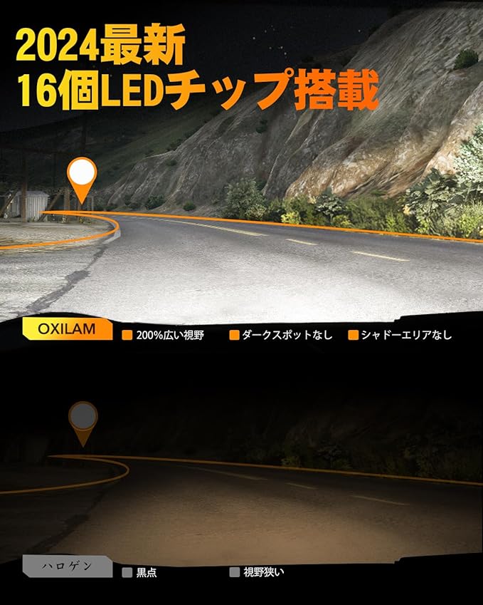 【視認性大幅向上】: OXILAM HB3 ヘッドライトLEDは16連のハイパワーLEDチップを超薄基盤を採用し、4倍の明るさと6500Kのホワイト光を提供します。このHB3バブルは純正バルブよりもやや遠方をワイドに照射し、センター手前を重点的に照射します。ロービームでは手前が明るく、ハイビームで光がより遠くまで届きます。フォグランプとしても適合します。より強い透過能力を持ち、雨の日や霧の日に遠くまで広い視界を提供し、道路上の動物やその他の障害物を事前に確認し、街中はもちろんのこと、田舎などの照明がない人里離れた道での安全運転を確保することができます。運転の安全性を効果的に向上させます。