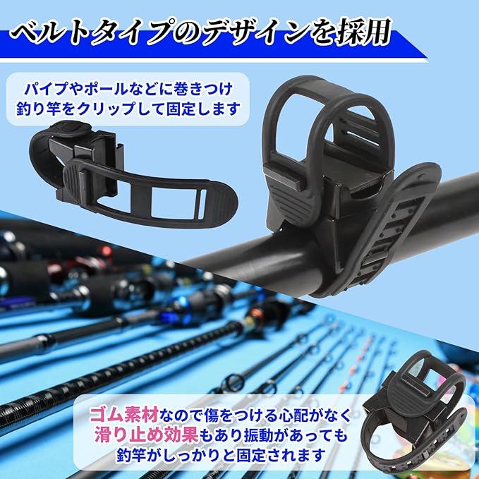 ✅ベルトタイプのデザインを採用しており、パイプ、ポール、バー(棒)などに巻きつけ、釣り竿をクリップして固定します。この特徴により、竿をしっかりと固定でき、安心して移動することができます。