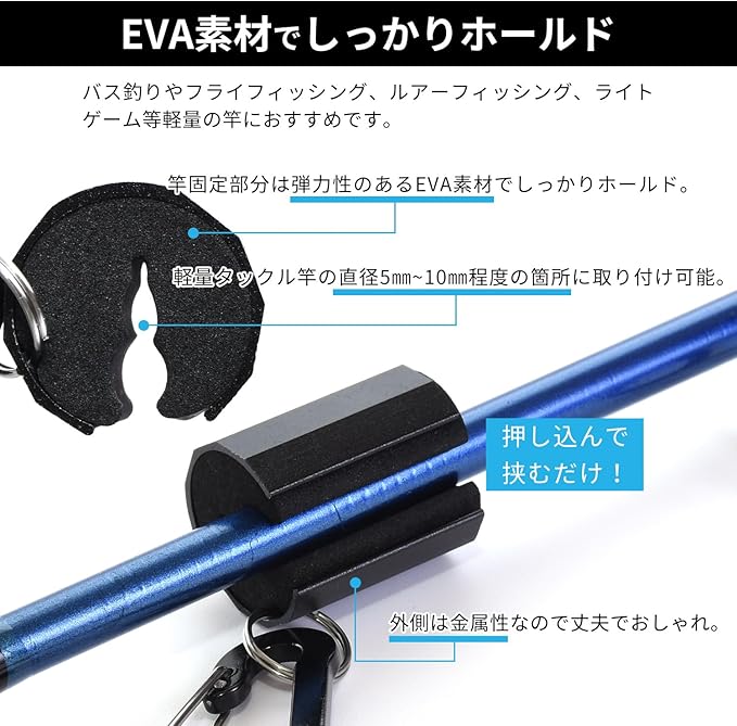 【スタイリッシュで使い勝手抜群】外装は金属でできており頑丈かつカッコ良いデザインです。ロッド保持部分は高品質のEVA素材でやわらかく、弾力性もあり竿をしっかり竿をホールドしてくれます。取り付けはカラビナなので腰や胸やベスト、ベルト、ウエストポーチ、リュック等お好きな箇所に簡単に取り付けることができます。