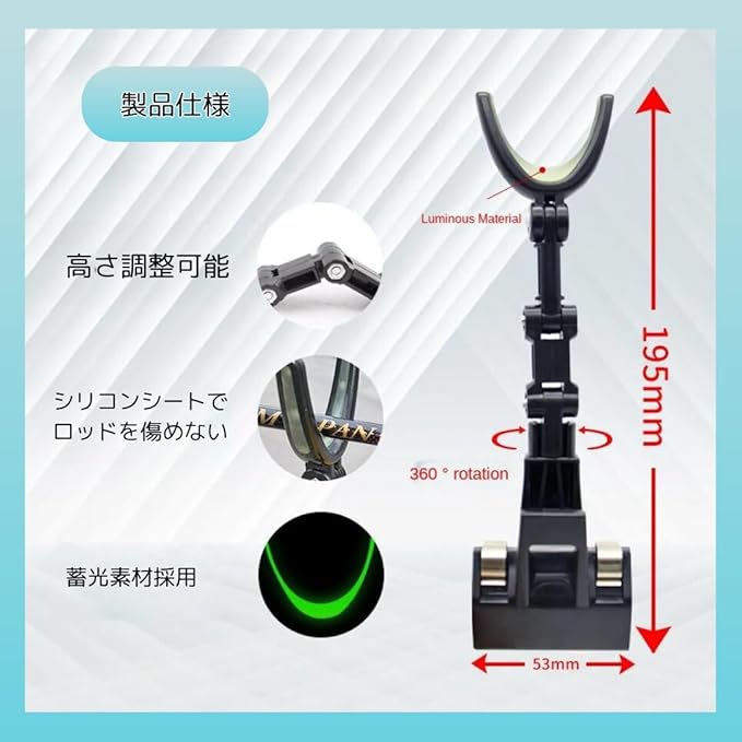 【商品】簡単にバケツやバッカンに取り付けられるクリップ式ロッドホルダーです。お好みの角度で固定し、360度向きも調整できます。釣り場での設置も簡単で、すぐに使い始めることができます。このロッドホルダーがあれば、手軽に釣りを楽しむことができ、釣果も期待できるでしょう。 【一時的なロッド置きに】釣りをする際、大切なロッドやリールを直接地面に置くことは抵抗があります。このクリップ式ロッドホルダーはその問題を解決します。2つ購入すると、釣りの幅も広がります。エサを交換したり仕掛けをセットする際、一時的にロッドを置くためのロッドホルダーがあれば、ストレスが少なくなることに驚くでしょう。 【夜釣りでも】竿受け部は先端に蓄光素材が使用されているため、夜間の釣りでも安心してご利用いただけます。 【取付簡単】簡単な取り付け方法で、工具が不要です。ロッドホルダーのクリップを固定するだけで取り付けが完了します。ホルダーの先端は360度回転し、本体は多関節アームを備えており、角度や長さの調整が簡単かつ迅速に行えます。コンパクトなデザインなので、持ち運びも簡単で、場所を取らずに収納できます。 【仕様】長さ19.5 5.3cm、クリップ、360度回転、多関節、色:ブラック ※モニターの環境により、色の見え方に若干差が生じる場合がございます。