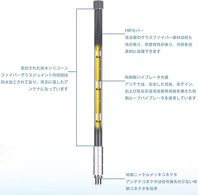 耐久性のあるファイバーグラス レドーム、アンテナの内部構造は銅製で、工業用グレードの構造です。 銅管は回路基板よりも優れています。銅管を使用すると、アンテナの定在波比が低くなり、より高い電力に耐えることができます。 一体型 N 型メス コネクタ。 24時間年中無休の運用に適しています。