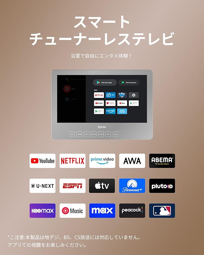 Sylvox 19V型 お風呂防水テレビ 浴室グーグルテレビ チューナーレス Google OS 650nits 液晶 スピーカー内蔵 IP66防水防塵 ネット動画対応 Google TV 浴室専用 アンテナ配線不要 受信料不要