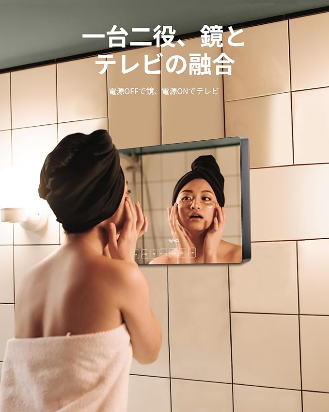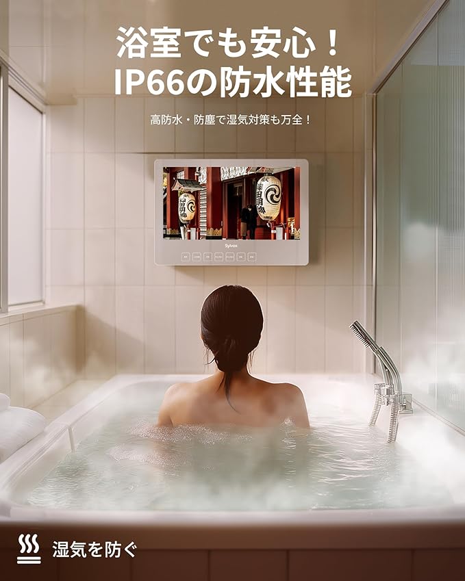 【1台2役!ミラー&お風呂テレビ】 普段はミラーとして使用でき、バスタイムにはテレビとして活躍!メイクや身支度に便利なだけでなく、お風呂でリラックスしながらお気に入りの動画や音楽も楽しめます。感電の心配もなく、SYLVOXの浴室専用テレビがあれば、一日の疲れを癒す自分だけの特別な時間に。