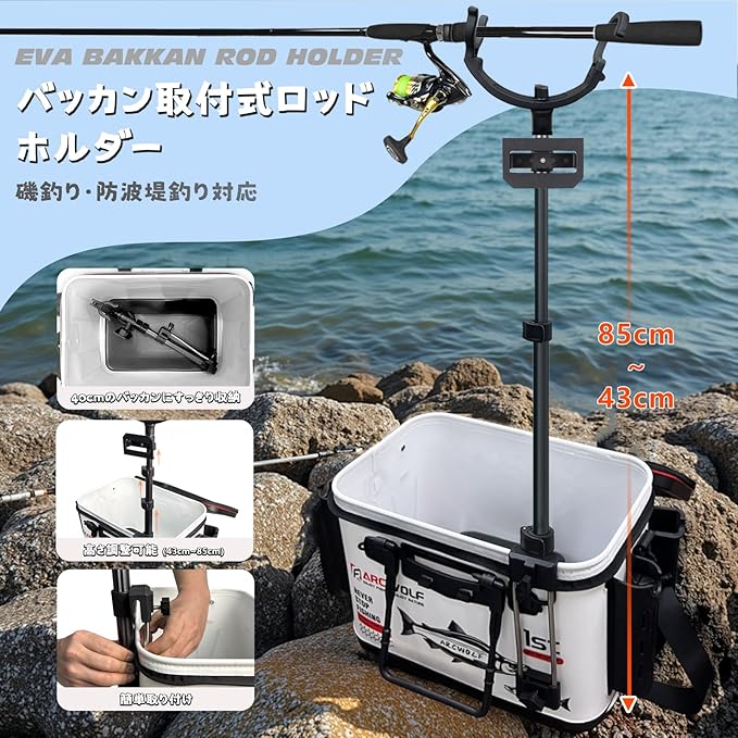 バッカン取付式ロッドホルダー 折りたたみ 高さ調整可能 しっかり固定 軽量アルミ 磯釣り 防波堤釣り 対応