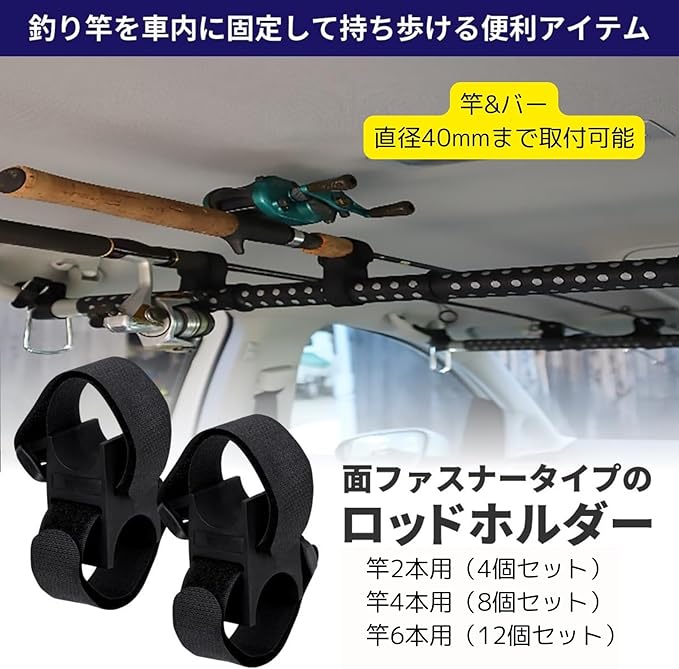 【複数人での釣りでも快適】友人や家族で車のシートが埋まっていても天井に釣り竿を固定するので邪魔にならず楽しく釣り旅行やお出かけを楽しめます。 また、ロッドホルダー2個1組で竿1本を固定できるのでロッドホルダーの個数を増やせば複数の釣り竿の持ち運びも容易です。