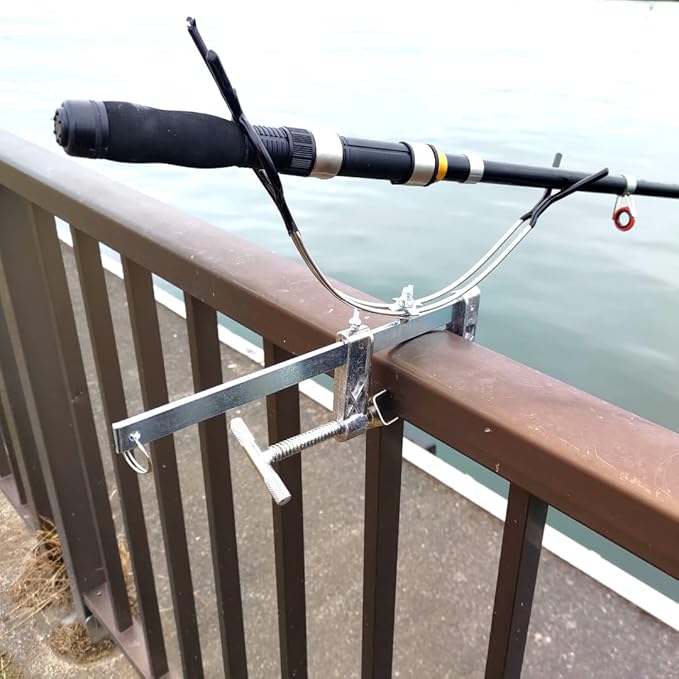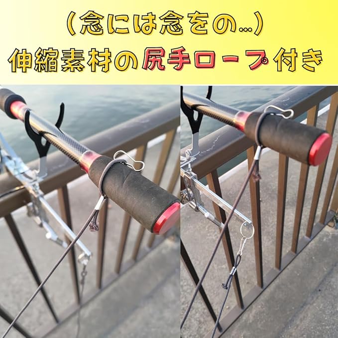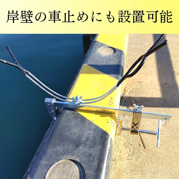 柵のある海釣り公園を始め船やボート・筏からの釣りなどで使える竿受けです。 可動域が25センチと通常の物より大幅に広く、普通の竿受けではハマらない幅のある柵・ 岸壁の車止めにも設置可能。 竿の角度、向きの変更も可能です。竿受部分は2WAY方式で単純に上に乗せるやり方と丸い部分に竿尻をはめ込んで固定する使い方ができます。磯竿6号など太い竿でも使用可能(極端に太くなければ大丈夫です)。はめ込んで固定すればアタリが来てもタックルを持っていかれる心配はありません。