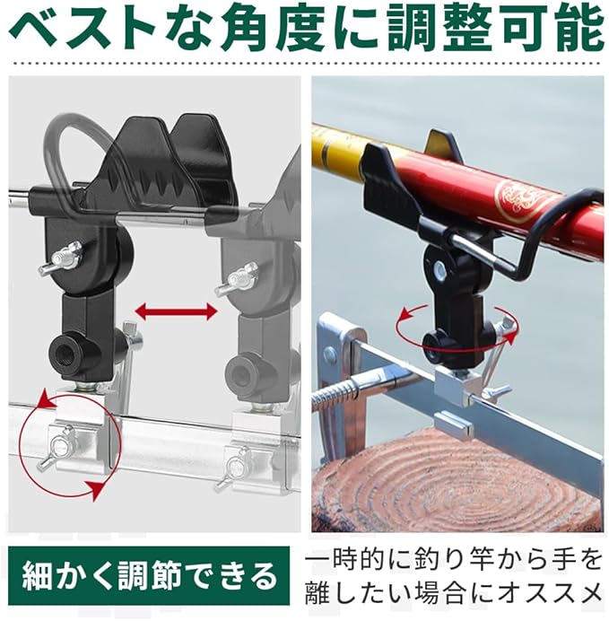 ロッドを固定するホルダーには防滑ゴムを採用しているため、ホルダーが傾いても滑り落ちる心配がありません。土台との接続部分にあるロックネジを緩ませることでホルダーを前後に動かせます。自分用はもちろん、釣り仲間へのプレゼントとしても人気です。
