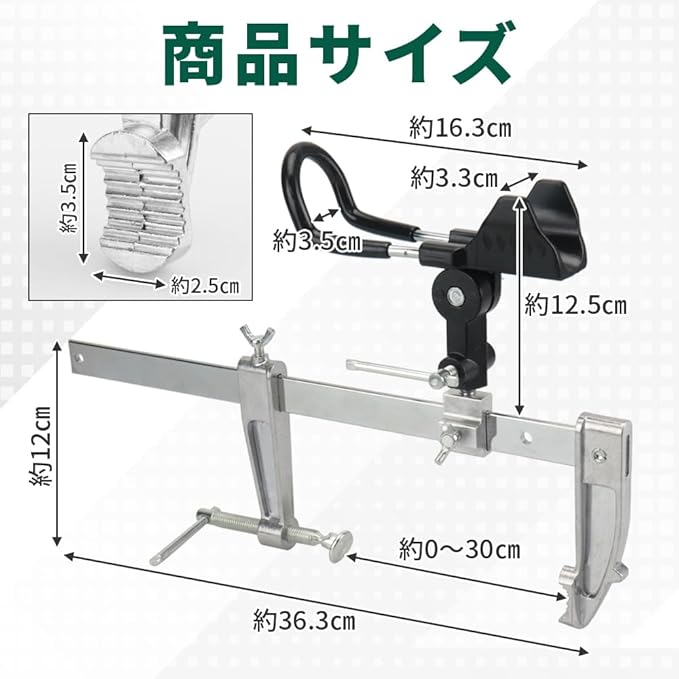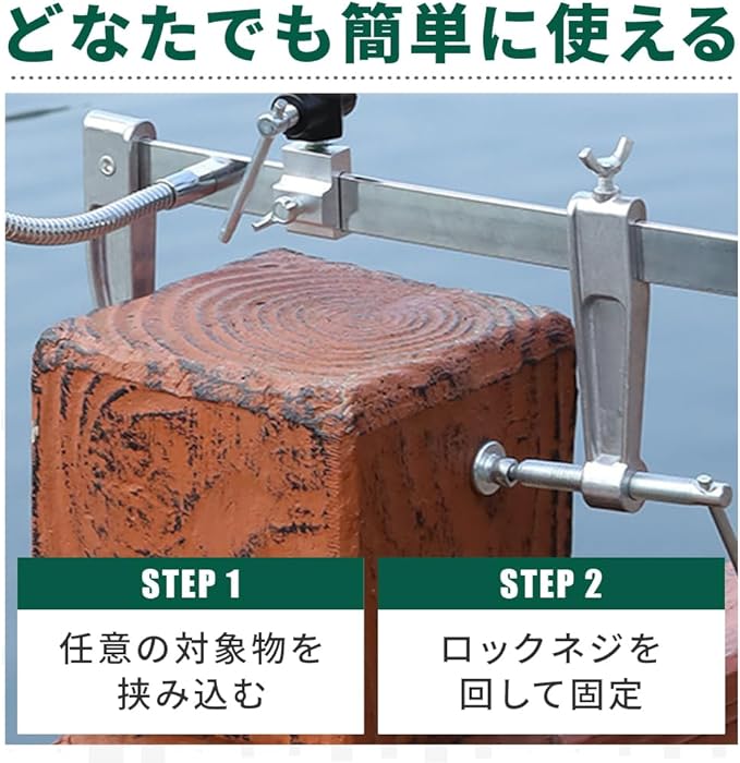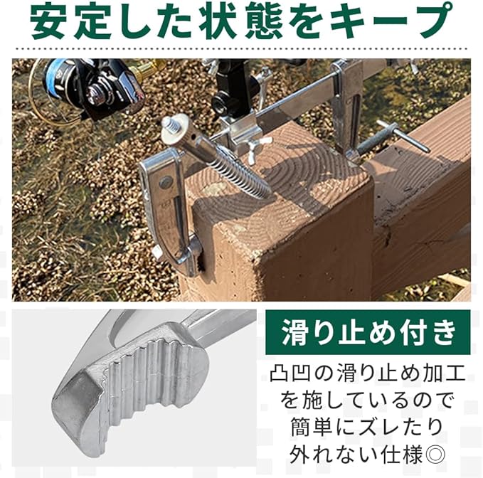 堤防の柵・ボートの縁・橋の手すりなどに設置できるロッドホルダーの土台は、約0cm~30cmの範囲で幅調整が可能。対象物を挟んだらロックネジを回すだけのシンプルな使い方も嬉しいポイントです。対象物との接地面には簡単にズレたり外れないよう、滑り止めの凸凹加工を施しました。