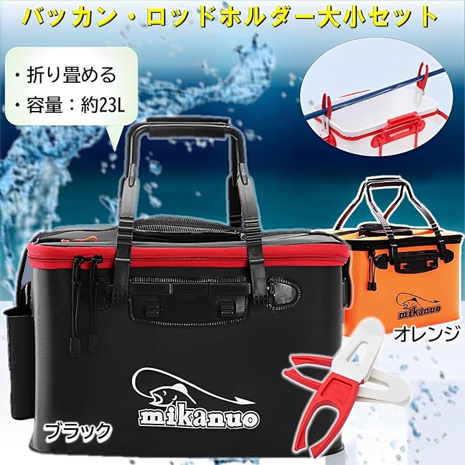【商品仕様】バッカン:40cm x 24cm x 24cm ロッドホルダー:大18cm 小15㎝ 高品質のEVA素を採用した、防水性、耐引裂性、耐久性に優れたバッカンと、ロッドホルダー大小の3点セットです。