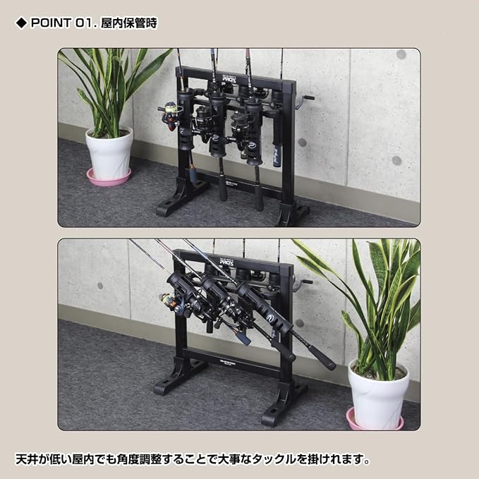 角度調節ができる多目的ロッドスタンド。ホルスターの角度を調節できるので屋内保管はもちろん、釣り場での竿受けとしても使用可能。