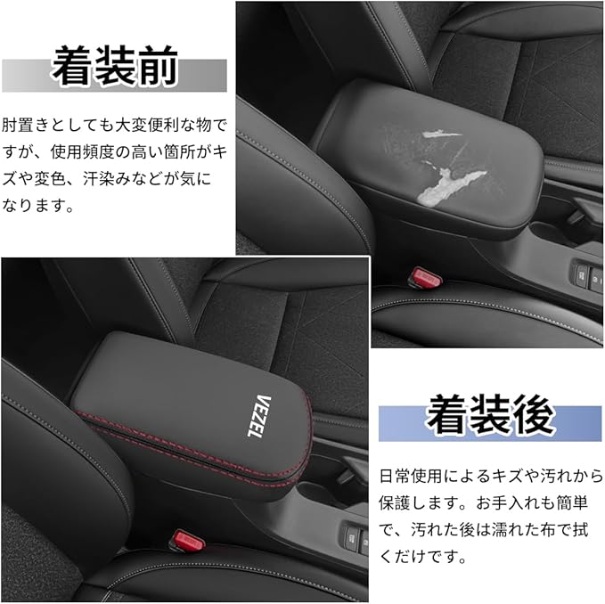 【キズや汚れ防止対策・お手入れ簡単】車のアームレストは肘置き・肘掛けとして大変便利な物ですが、高い使用頻度によるキズや変色、汗染みがつく場合もあります。このヴェゼル 専用アームレストカバーをご利用いただくと、経年劣化やダメージを軽減できます。お手入れも簡単で、汚れた後は濡れた布で拭くだけです。汚れに強い素材なので、濡れた布やティッシュで拭けば綺麗になれます。