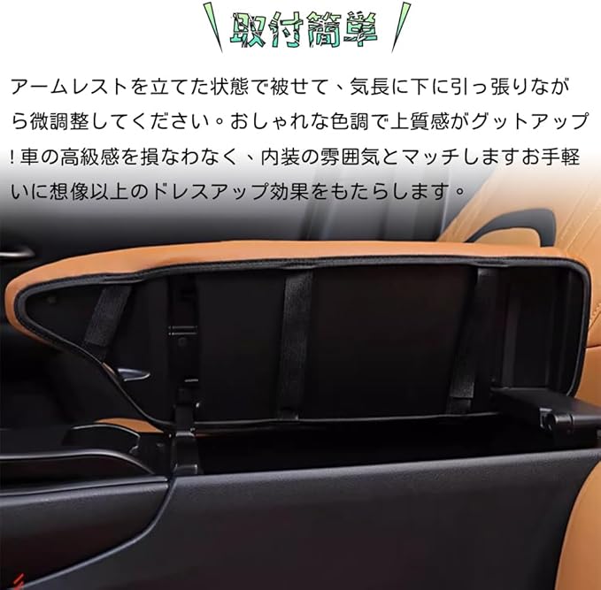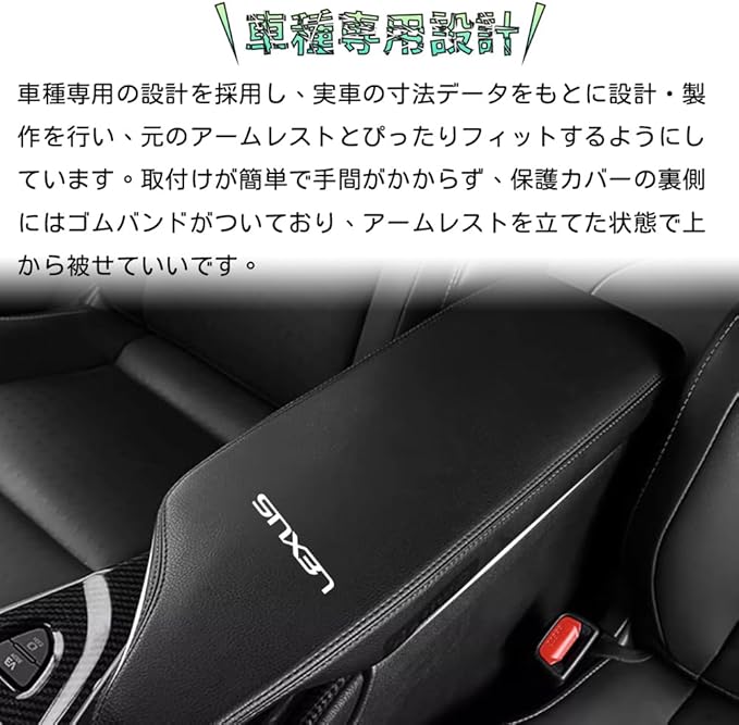 【車種専用・取付簡単】:車種専用の設計を採用し、実車の寸法データをもとに設計・製作を行い、元のアームレストとぴったりフィットするようにしています。取付けが簡単で手間がかからず、保護カバーの裏側にはゴムバンドがついており、アームレストを立てた状態で上から被せていいです。