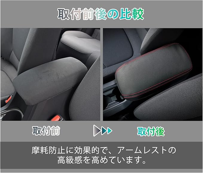 【車種専用・取付簡単】車種専用の設計を採用し、実車の寸法データをもとに設計・製作を行い、元のアームレストとぴったりフィットするようにしています。取付けが簡単で手間がかからず、保護カバーの裏側にはゴムバンドがついており、アームレストを立てた状態で上から被せていいです。
