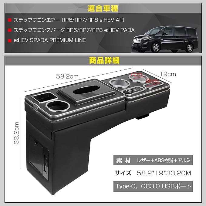 【適合車種】コンソールボックスはステップワゴン スパーダ エアー RP6 RP7 RP8 e:HEVスパーダ e:HEVエアーに適用する。アームレスト本体のサイズは58*33*19cmです。車種やサイズをご確認の上ご購入ください。