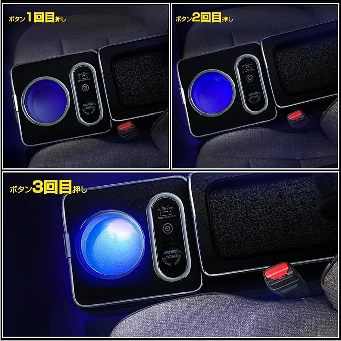 【LED付き】夜間の車内照明用LEDライトが付きで、暗い時間帯に足元などを明るくになります。3色変換の青いLEDテープライトで車内を装飾し、車内を好みの明るさで点灯し、手軽におしゃれな空間を演出可能です。