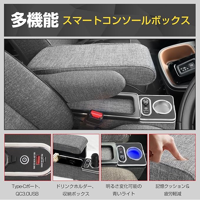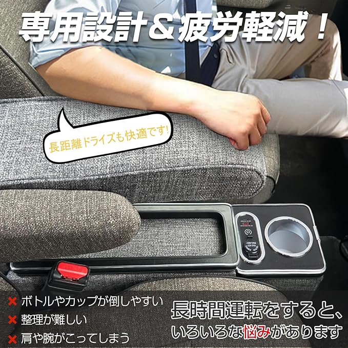 【疲労軽減】運転席からすぐにアクセスできる収納スペースとして使えるだけでなく、長距離ドライブなどの疲労軽減に役立ってくれるのが、運転の手を休めます。ボックスの上部には便利な肘掛け(アームレスト)を設置している。リラックス効果のある肘掛けはドライブ中の疲労を軽減し、快適なドライビングをサポートします。