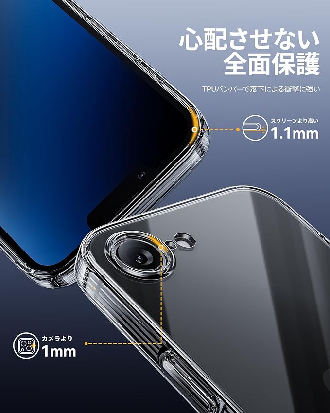 【スクリーン&カメラ保護】スマホケースの縁はアイフォン16eの画面より1.1mm高く、カメラレンズより1mm高い仕様です。iPhoneを平らな場所に置いたときにスクリーンやカメラがこすれて傷つくのを防ぎます。