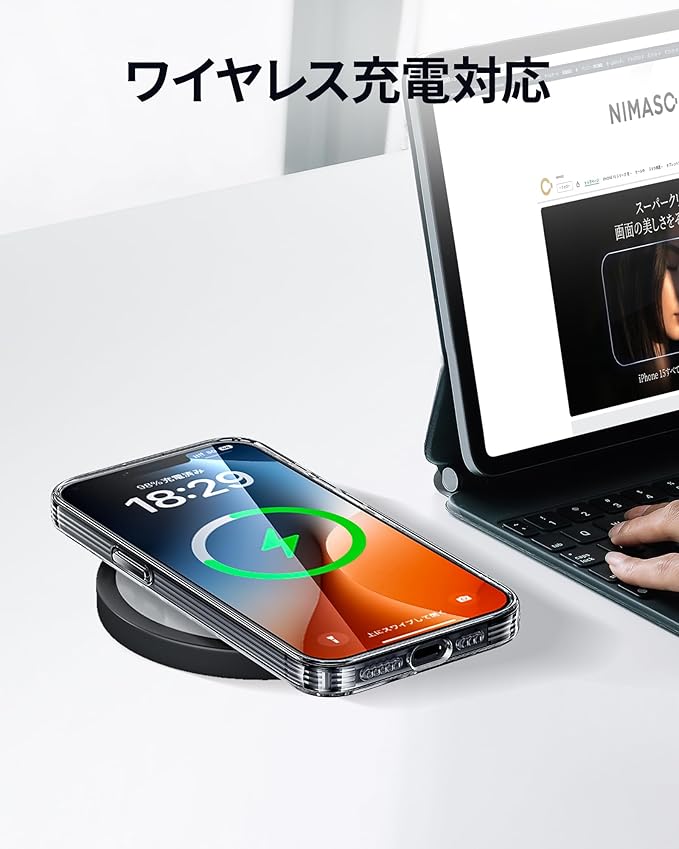 【ワイヤレス充電対応】薄型で軽量の仕様。ケースを装着したままワイヤレス充電ができる。精巧なカットアウトによって、ボタン操作も快適です。(本製品はMagSafe機能が付いていないので、MagSafe充電器を使う場合、ケースに磁力がないため、ピタッとくっつかない事がございますので、ご注意ください。)