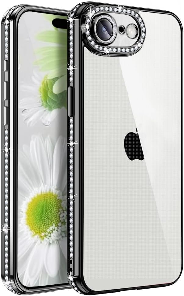 MuZiF iPhone 16e 用 ケース クリア メッキ加工 キラキラ 背面全透明 サラウンドレンズ保護 カメラ保護 TPU ソフトケース 薄くて軽い 女性 人気 耐衝撃 携帯カバー ラップホール付き アイフォン 16e 用 スマホケース (iPhone 16e用,ブラック)