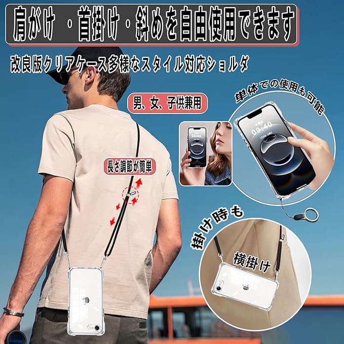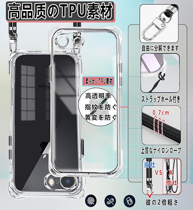iPhone 16e 用 ケース アイフォン16e ケース【ストラップ2枚付き】調節可能な ショルダー 肩がけ 首掛け 紐付き 斜めがけ スマホケース いphone16e 薄型 透明 軽量 シリコン TPUバンパー ストラップホール付き [耐衝撃 傷防止 米軍MIL規格 防指紋]ワイヤレス充電対応 あいほん16E カバー TPU(クリア)