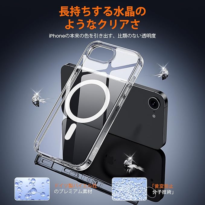 【水晶クリア&黄変防止】高品質なバイエル社製超透明TPU、PC、アクリルバック材質を使用したいphone16e ケースは、ナノ酸化防止層を採用し、汚れや汗を効果的に防ぎます。時間が経っても黄ばんだりベタついたりしない設計で、新しいiPhoneの本来の美しさを楽しむことができます。