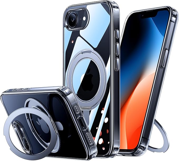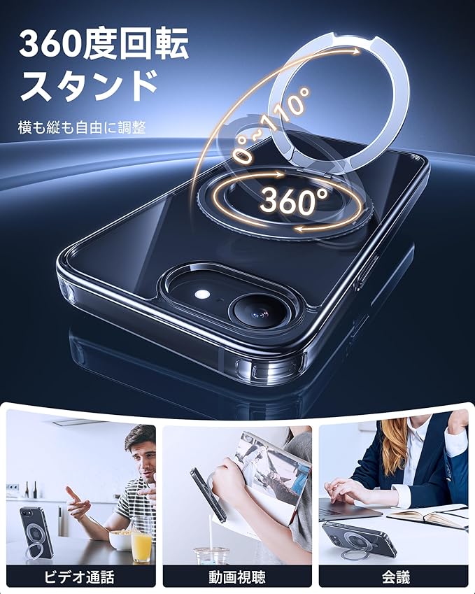 NIMASO iPhone 16e 用 ケース 縦横両対応 360 回転スタンド いphone 16e 用 ケース MagSafe対応 携帯スマホケース(6.1インチ) リングマグネット搭載 カバー 米軍MIL規格 耐衝撃 傷つけ防止 指紋防止 黄变防止 クリアケース (氷星シリーズ)DSC24L1554