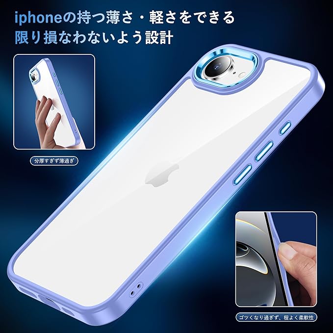 【絶妙バランス・快適操作】クリアケースの保護性能を保ちながら、スマートさを損なわないよう、薄さと強度のバランスを取り、手にフィットする程よい厚みで、快適さが保ち、最適な設計で作り出す。アイフォン16eのボタンやレンズなどの細部に基づいて設計された専用スマホケースは、ぴったりとフィットしています。ボタン、カメラ位置も含めて寸法はバッチリでスマホケースをつけていないかのように快適に使用できます。