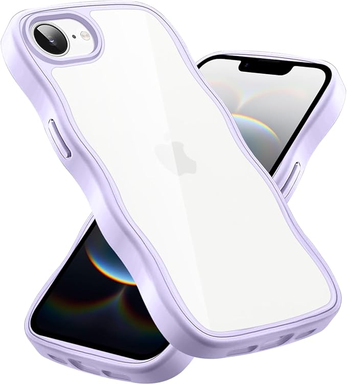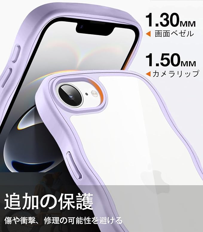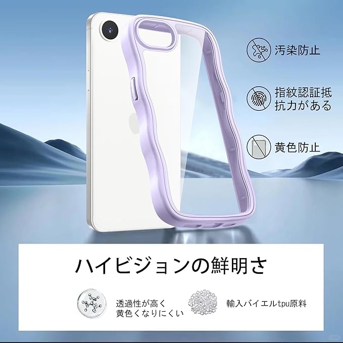 クリア iPhone 16E ケース かわいい 波状フレーム うねうね カバー 耐衝撃 アイフォン16e スマホケース 滑り止め 人気 可愛い 落下防止 ワイヤレス充電対応 (パープル)