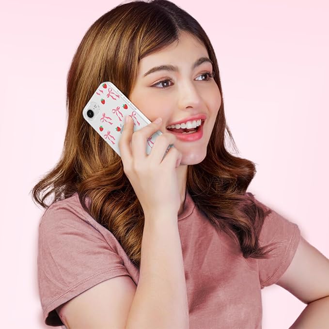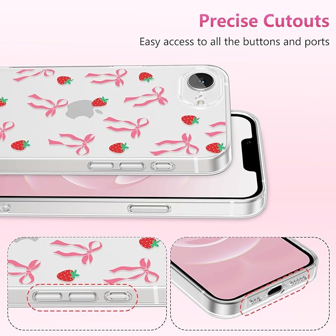 ZTOFERA iPhone 16e用クリアケース かわいい蝶々結び いphone16e ケース 透明 おしゃれ 人気 韓国 リボンパターン スマホケース ソフトTPU バンパーケース 軽量 耐衝撃 アイフォン16e 女性 携帯カバー (いちご)
