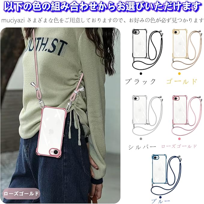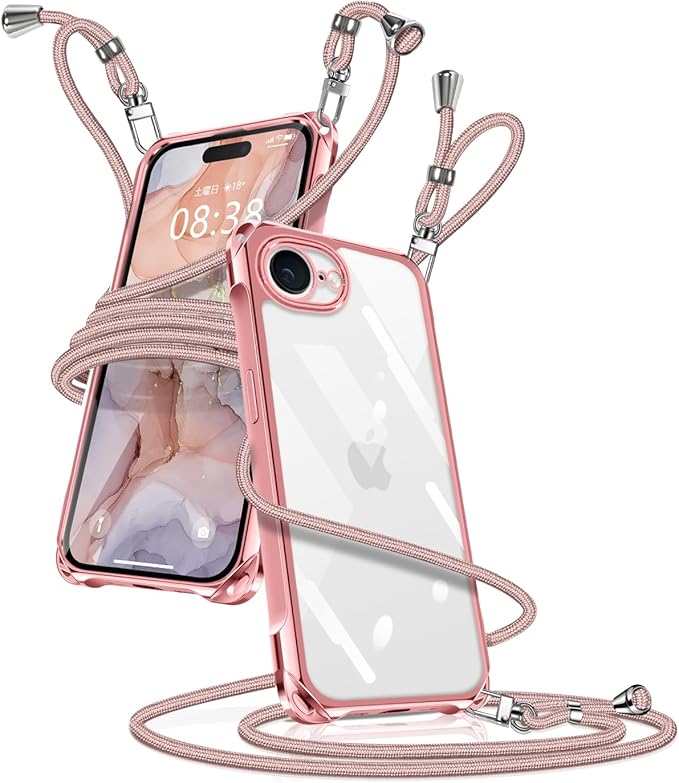 iPhone 16e 用 ケース クリア ショルダー iPhone16e スマホケース アイフォン16e カバー 肩掛け 斜めかけ 縄掛けケース 透明 薄型 軽量 TPU 携帯ケース 紐付き 斜めがけ 織りストラップ付き 長さ調整可能 取り外し可能 落下防止 紛失防止 ワイヤレス充電対応(ローズゴールド)